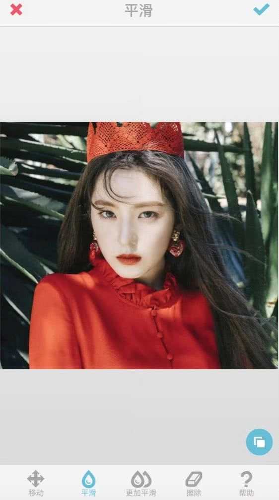 然后用美图秀秀的局部磨皮工具或者facetune里面的“平滑工具”(相当于磨皮工具)磨一下平时化妆打高光的地方,比如额头、鼻梁、下巴、眼窝下方等等(根据自己情况而定)。