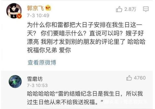 什么是社会主义兄弟情?大概就是郭京飞和雷佳音这种,交换衣服穿却互相埋汰,事业低谷时贴身陪伴却选在好友生日这天结婚……不损郭京飞就不是雷佳音,不刺激雷佳音,郭京飞的人生将失去了乐趣。他们对于彼此就是这样神奇的存在。