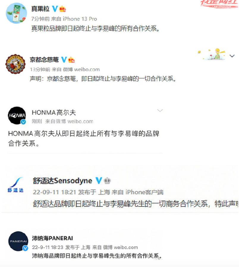 各大品牌方陆续发出声明,与李易峰解除合作关系。