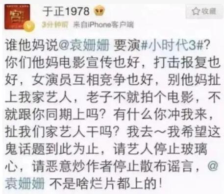 于正还因为袁姗姗出演《小时代》的传闻和郭敬明隔空对骂:" 姗姗不是啥烂片都上的!"