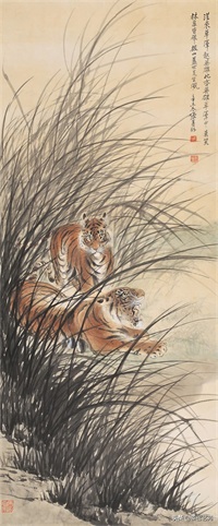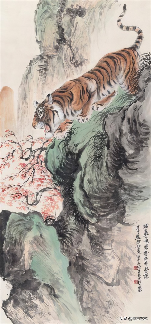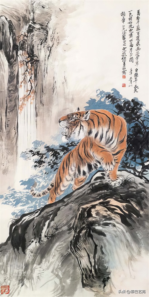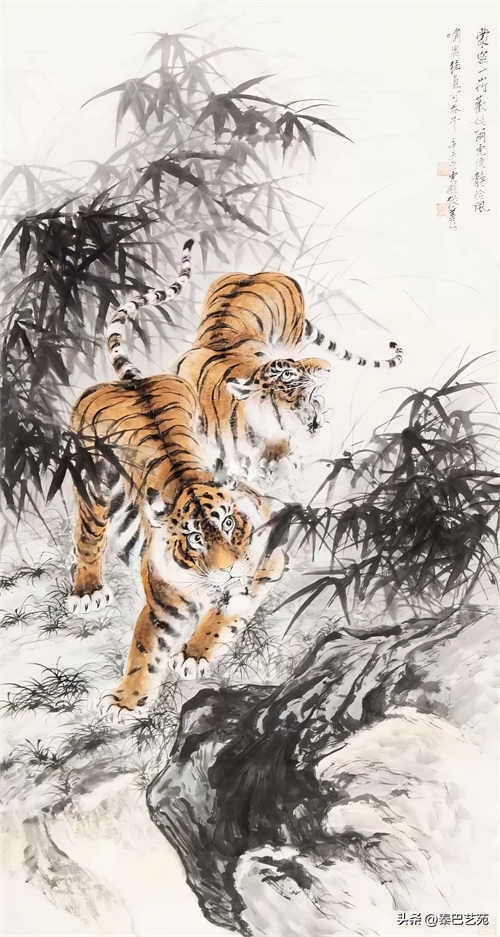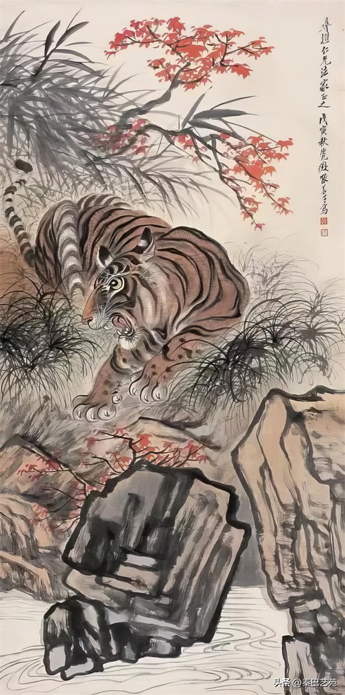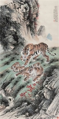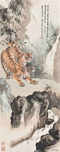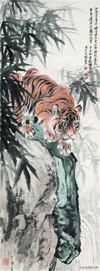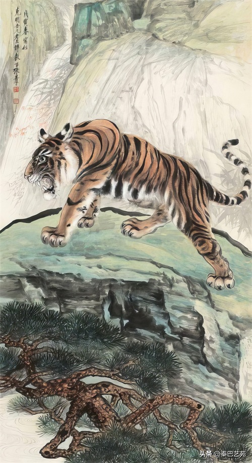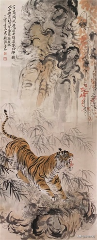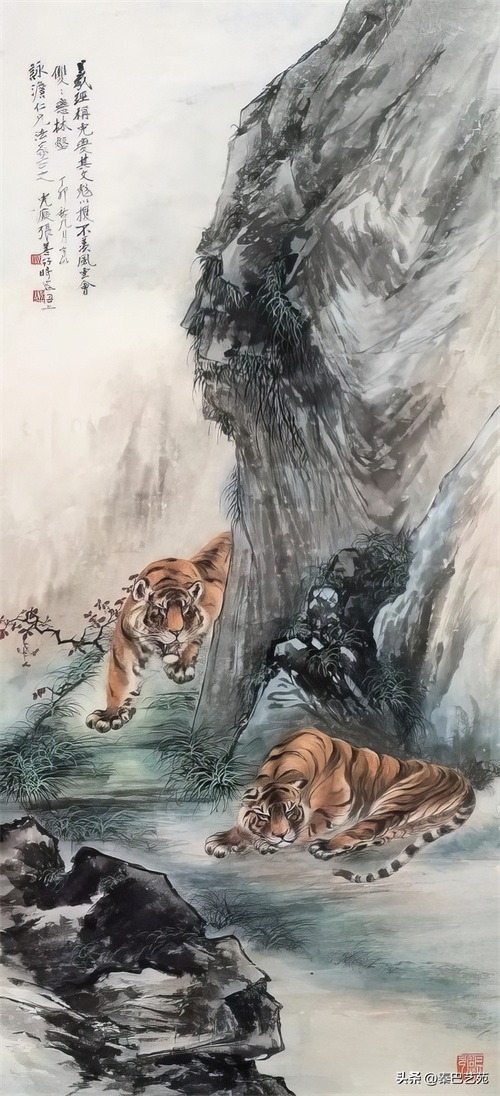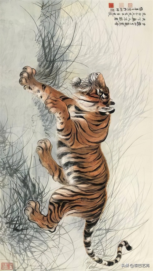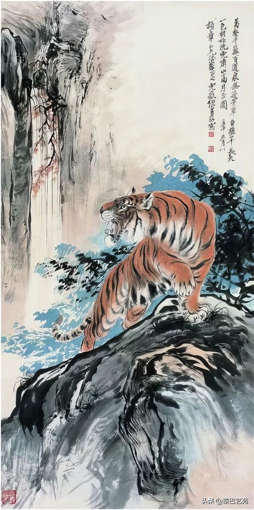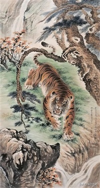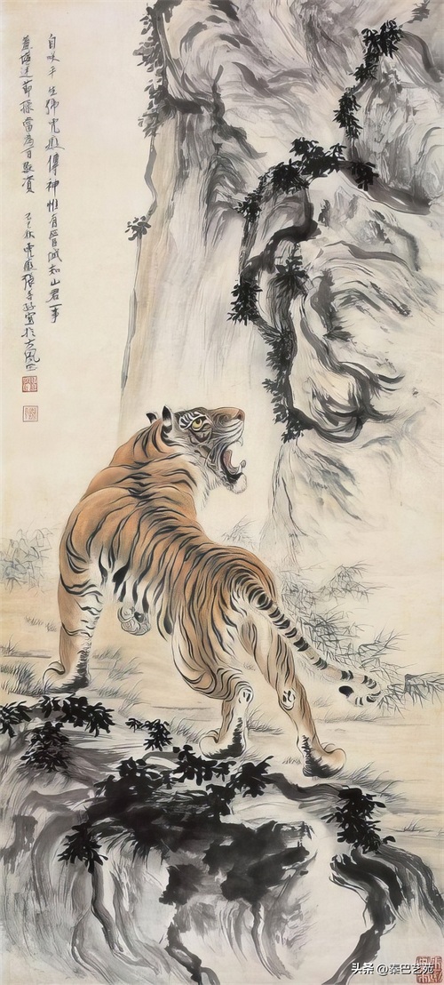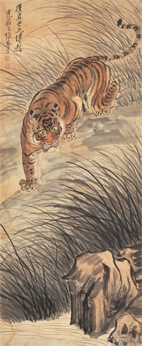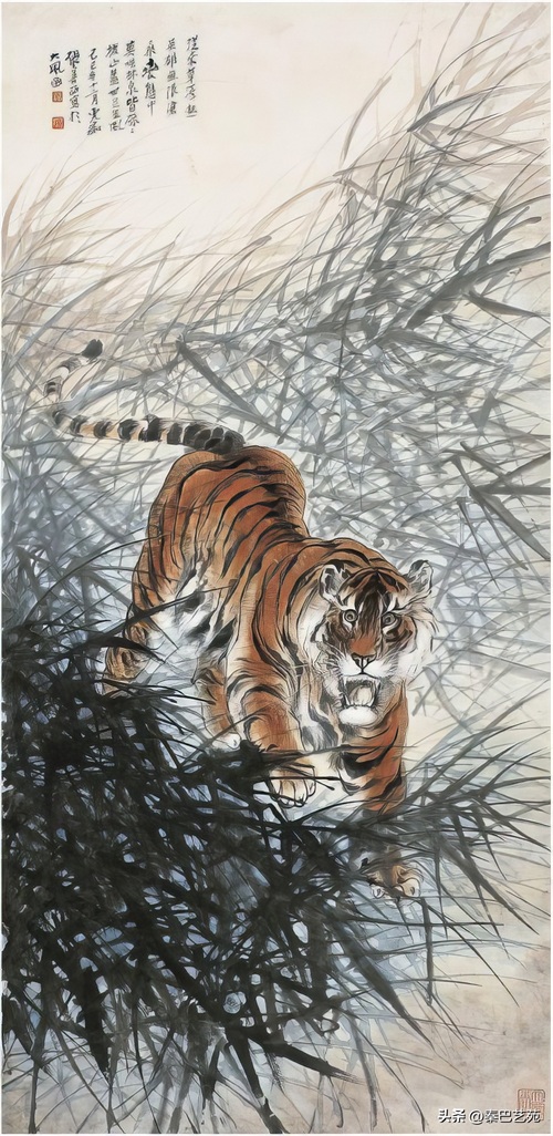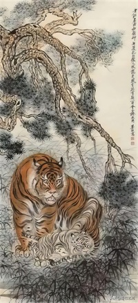 张善子注重对老虎形态的准确描绘,同时也注重捕捉老虎的神韵和气质,使他的老虎画作品既有形似,又有神似。张善子在画虎时,既采用了写实的技法,又融入了写意的表现手法,使画面既有真实感,又有艺术感。张善子擅长运用线条和墨色来表现老虎的皮毛、肌肉和骨骼结构,使画面具有强烈的立体感和动感。张善子在画虎时,不仅注重表现老虎的形态和神韵,还注重传达自己对老虎的情感和理解,使作品具有深刻的内涵和情感。张善子在画虎技法上不断创新,形成了自己独特的风格,使他的老虎画作品具有很高的艺术价值和审美价值。