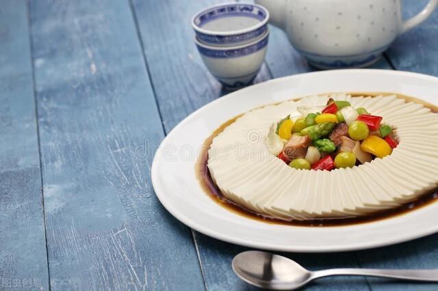 3、豆腐蒸好取出,把配菜烫熟,放在豆腐中间,淋上高汤