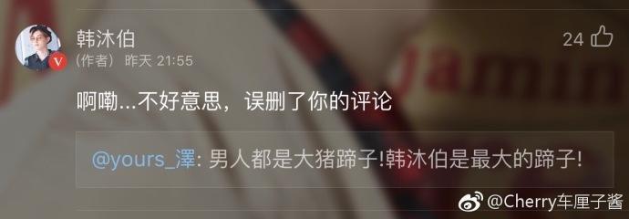 粉丝在韩沐伯动态下面评论,结果遭韩沐伯手滑删除,忙回复道歉。