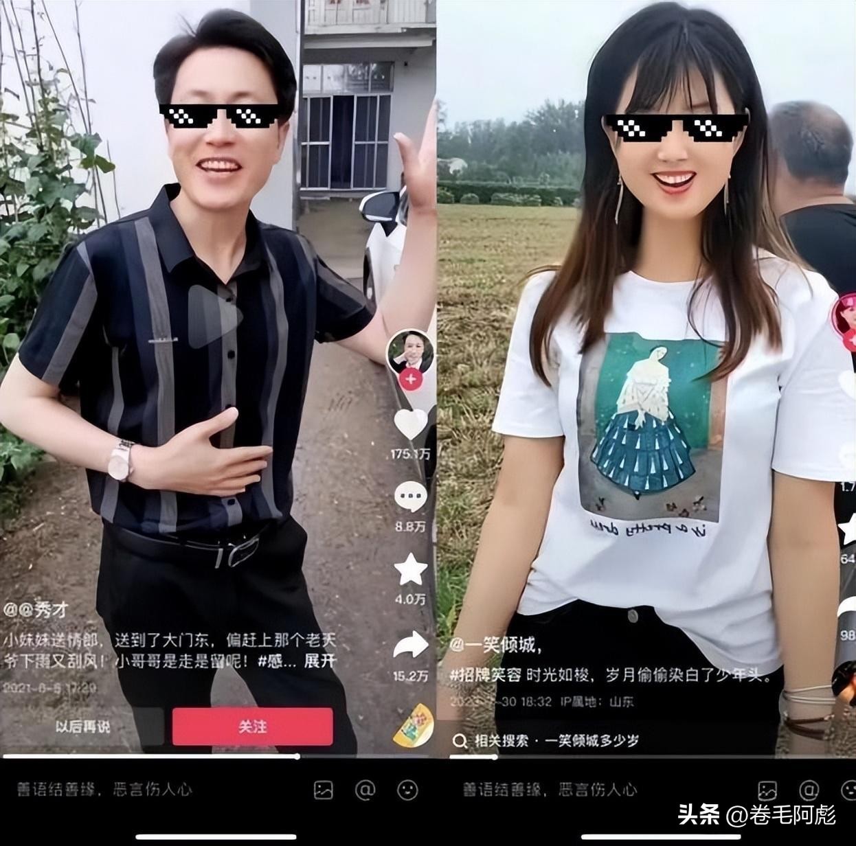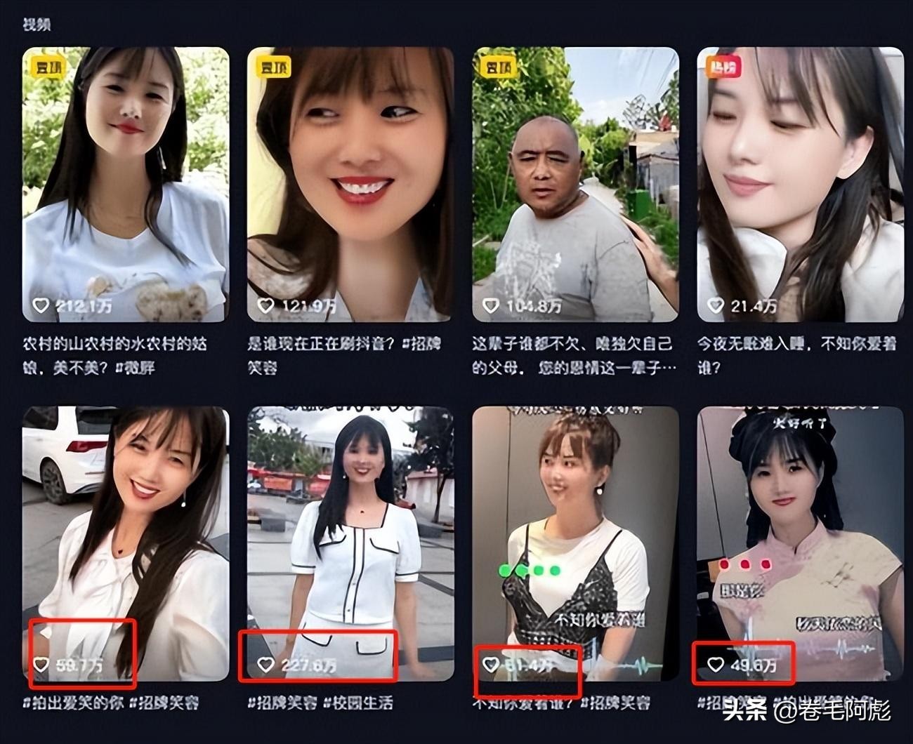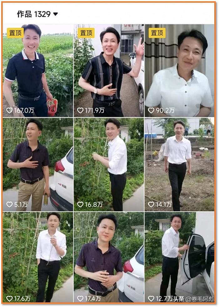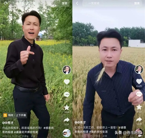 秀才拍摄的视频同样十分的简单,几乎都是在农田里假装羞涩的用拳头捂嘴,再撩一下头发、舔舔嘴唇,最后跟着音乐对对口型而已。