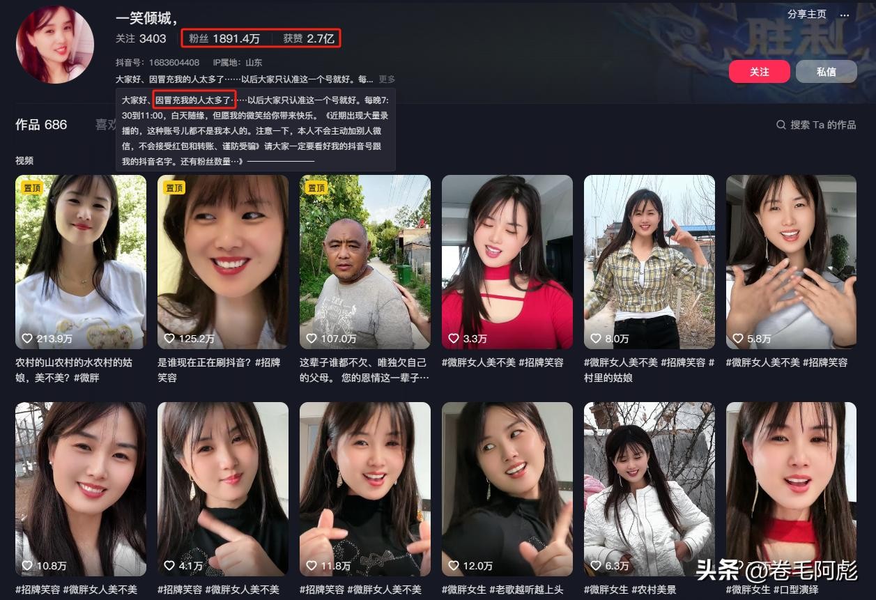 就这样她在极短的时间内,就疯狂吸粉上千万,同时“一笑倾城”这个账号也被更多的人看到。