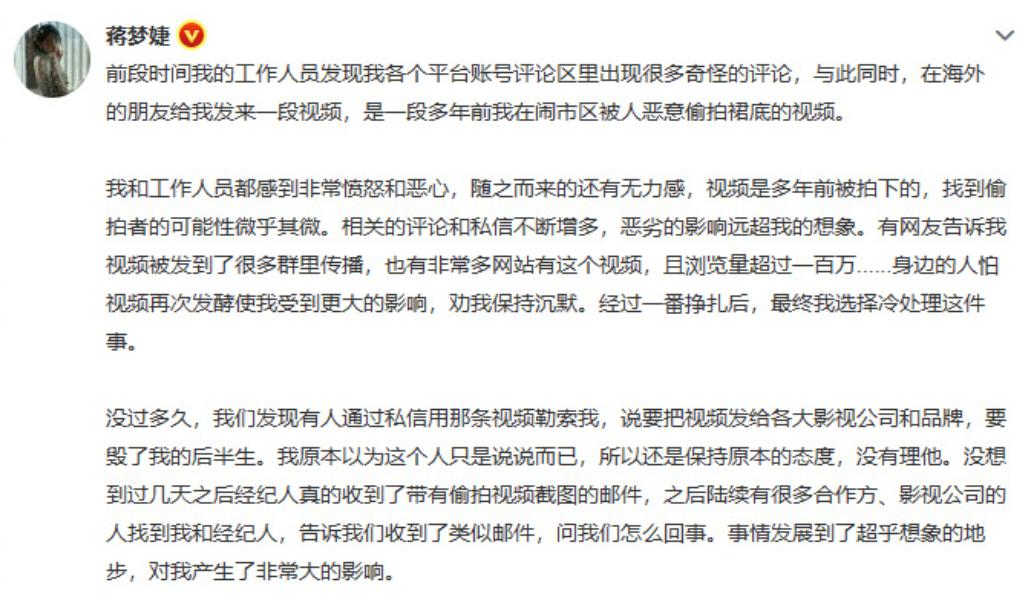 正如不久之前蒋梦婕被人用多年前的偷拍裙底照勒索时才详知此事。