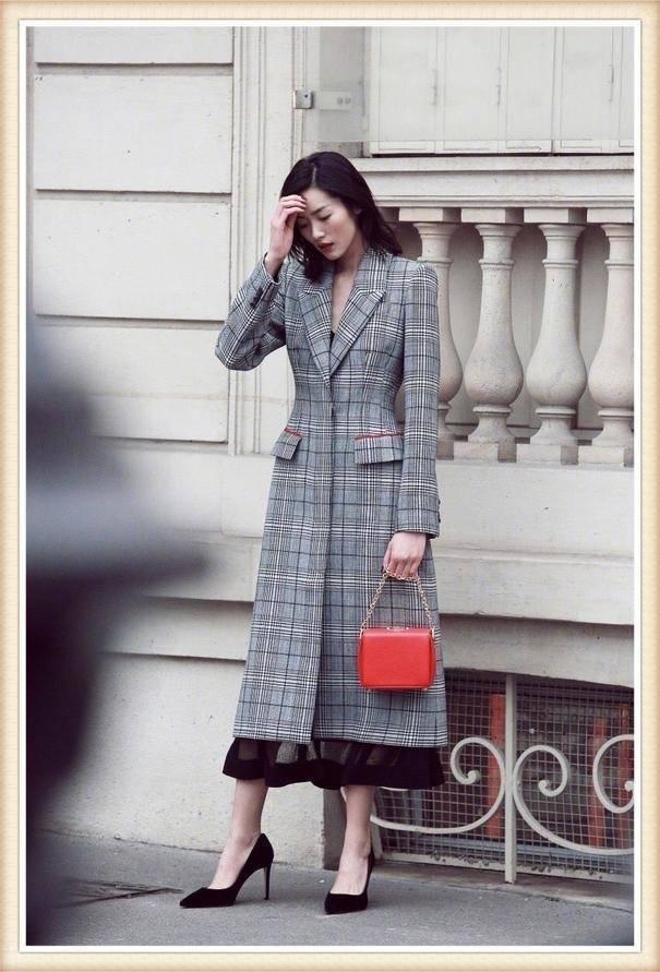 穿起复古的长款格子外套搭配蕾丝裙,还有可爱的红色小包包,女人味十足。