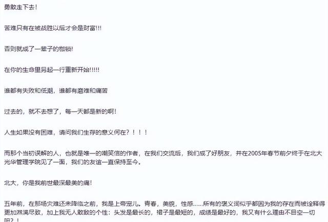 两天后,一篇《北大,你是我前世最深最美的痛》,出现在北大的校园论坛上。史恒侠不知道,这篇文章,将给她的人生带来新转机。
