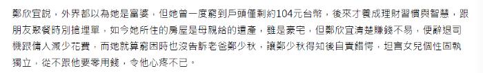 后来郑欣宜回忆道,最窘迫的时候,她的户头仅剩下104元台币。但她仍未因此向郑少秋求助过。