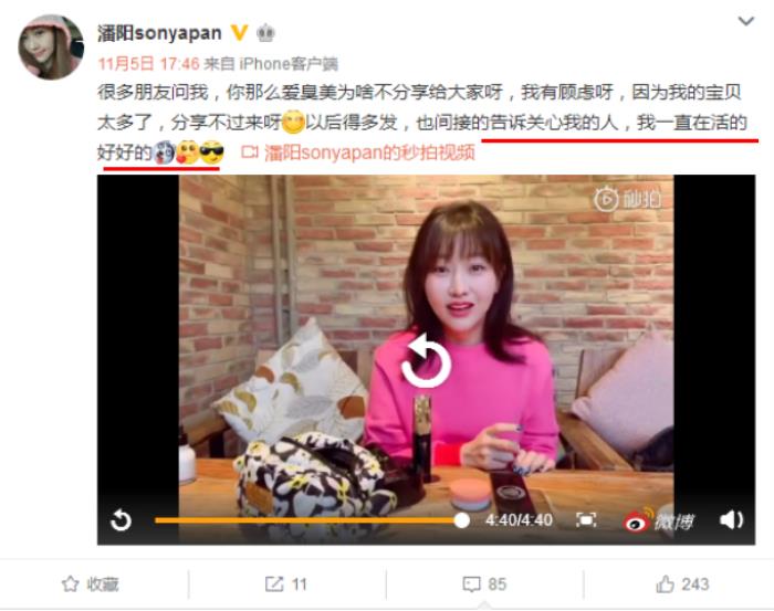 潘阳在微博中专门录了一个有关于自己化妆品的视频,之后还为这段视频配了一段文字:“很多朋友问我,你那么爱臭美为啥不分享给大家呀,我有顾虑呀,因为我的宝贝太多了,分享不过来呀!以后得多发,也间接的告诉关心我的人,我一直在活的好好的。”所以“被死亡”的事情已经给潘阳带来了很大的困扰,所以才会在微博中为自己澄清真相!