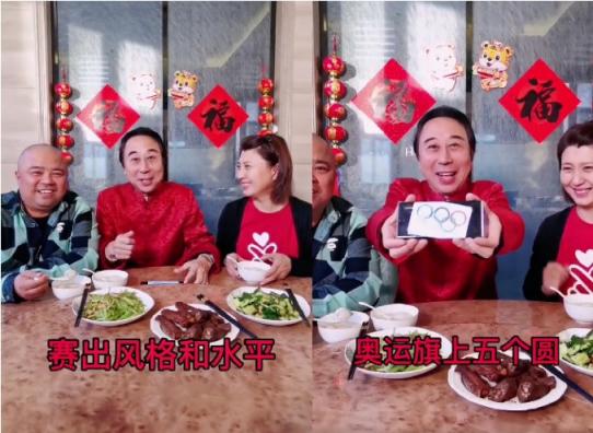 冯巩和阎学晶从元宵节祝福谈到冬奥会,也借此机会为运动员加油,最后,冯巩拿出了手机上附带的奥运五环,非常困难。
