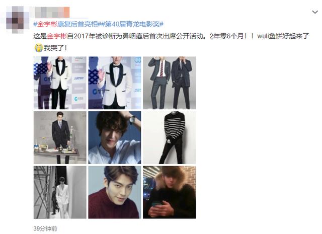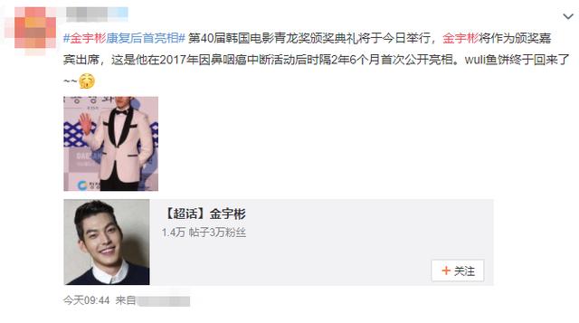 社交平台各个大V早在电影奖尚未开始时,就刷起了“金宇彬病愈首亮相”、“金宇彬康复后首亮相”等话题,纷纷感慨“我们‘鱼饼’要回来了!”