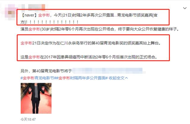 这之后不久,也就是11月21日,金宇彬正式宣布抗癌成功,宣告复出,而复出的第一站,就是本次青龙电影奖。
