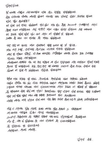 2017年12月29日,金宇彬在个人官咖上公开亲笔信传达近况,他在信中说:“因为有大家的应援及祈祷,顺利完成了3次的抗癌治疗和35次的放射线治疗,因为有大家上传在粉丝站和SNS尚的应援的话,使我自己更加有力量,真的非常感谢。”