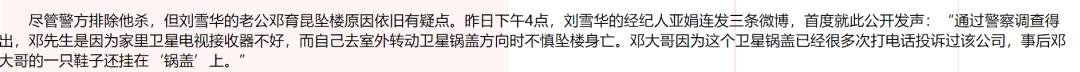 但到底哪种说法,则至今没有公开。自此之后,刘雪华又变成了孤身一人,丈夫离世的消息让刘雪华心碎,据说他们家住在三楼,所以刘雪华不能接受丈夫自杀的说法,接受采访时她哭成泪人,难以接受丈夫离世的现实,她说在自己心里,只把丈夫去世当作他去旅行来看待。
