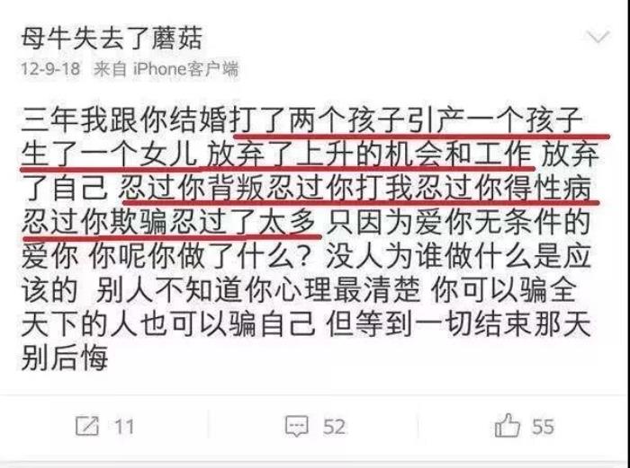 刘雨欣连发数条微博控诉自己被丈夫抛弃的经历,称自己为了丈夫打了两个孩子,生了一个女儿,放弃工作机会,甚至忍受他得性病和三年来多次出轨。