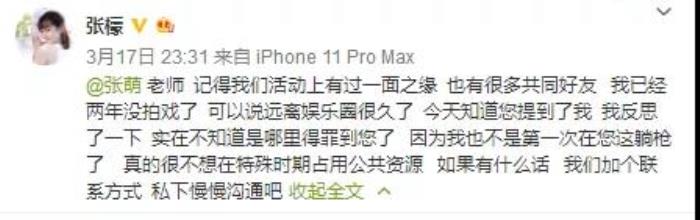 随后,张萌在微博上发视频致歉并解释事情的来龙去脉,同时表示自己并没有嘲讽张檬的意思,无意打扰,说声抱歉。