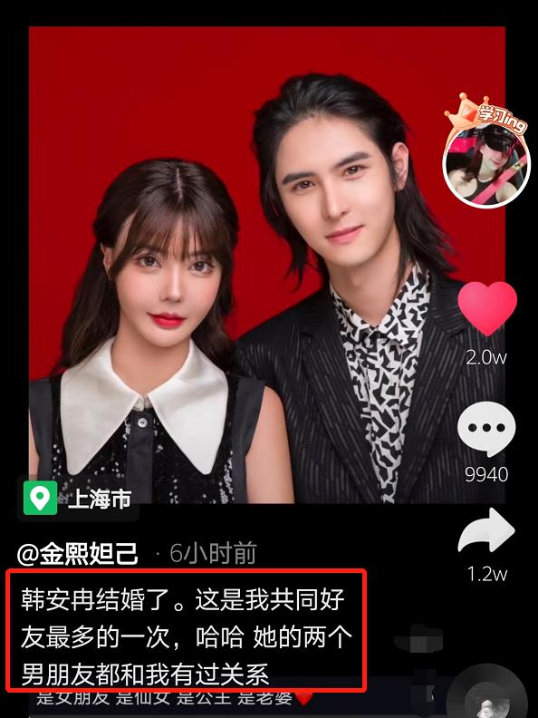 9月10日,一位ID名为“金熙妲己”的女网友爆料网红韩安冉新老公的私生活,配文称:“韩安冉结婚了。这是我共同好友最多的一次,她的两个男朋友都和我有过关系。”
