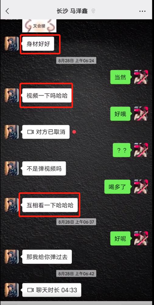 在该网友晒出的聊天记录中,一位备注为“长沙马泽鑫”的男性一边夸赞女生身材好,一边不停地要求和她视频通话。此时显示的时间为8月28日。
