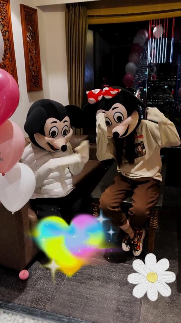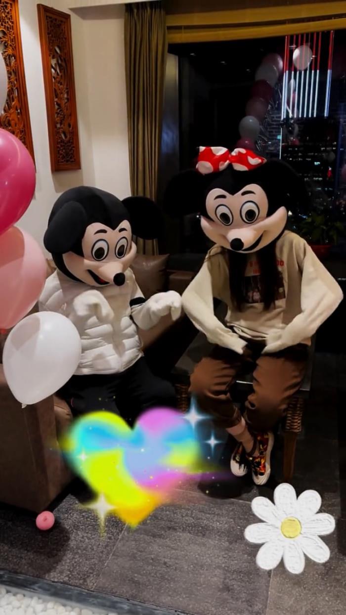 从画面来看,室内是中式装修风格,房间里挂了很多气球,布置得很喜庆,不知他们是不是在沈阳的家里。本山大叔坐在沙发上,女儿球球则是坐在了茶几上,两人造型都比较休闲,一边唱生日歌,一边跟着音乐挥手做动作,米老鼠头套显得减龄又可爱。