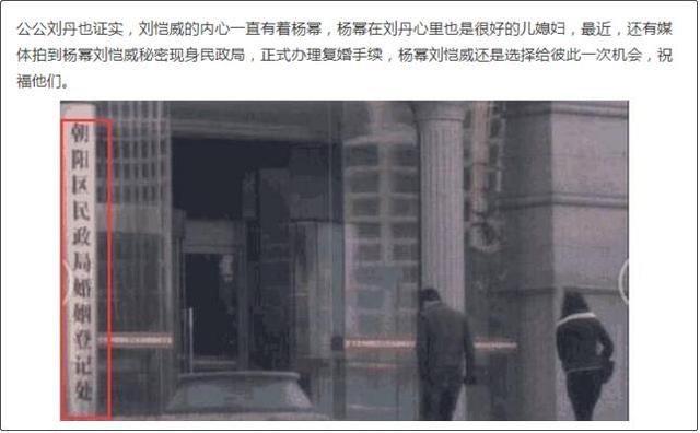 与此同时,也有网友爆料称杨幂刘恺威已经秘密复婚,两人被拍到一同前往北京朝阳民政局正式办理了复婚手续。而此消息还得到了刘恺威爸爸刘丹的证实,刘丹表示儿子心里其实一直都有杨幂,而杨幂也是一个很好的儿媳妇,对于两人的复婚俨然是无条件支持的。