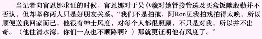 被人目睹,官恩娜澄清两人就是好朋友关系,阿 Ron(吴卓羲)见她拍戏太晚,所以顺路送她回家,称赞对方很有绅士风度。