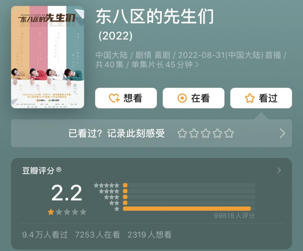 《东八区的先生们》,开播豆瓣 2.4,现在评分 2.2。