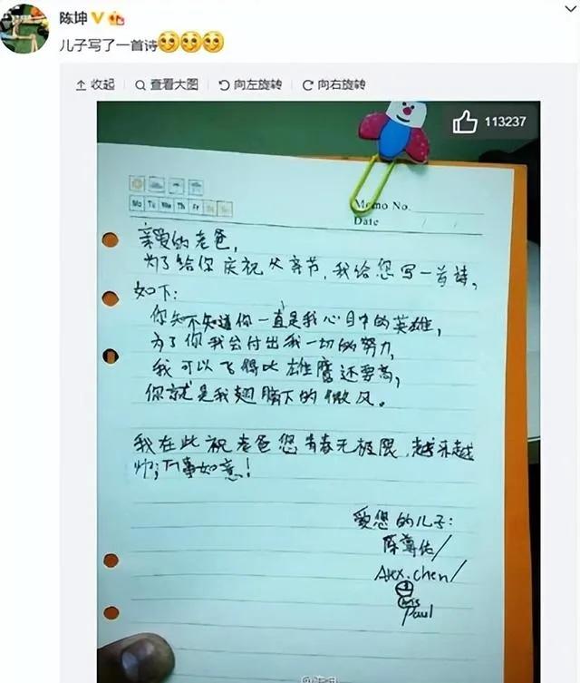 只不过儿子这字也太飘了,陈坤研究了很久才知道他写的是什么。