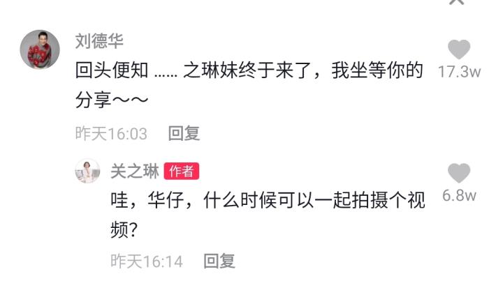 关之琳也亲切地回到:“哇,华仔,什么时候可以一起拍摄个视频、?”