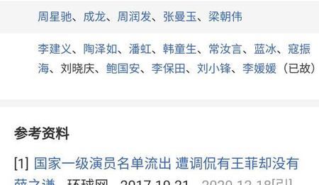 有些人肯定会说“百度百科”“搜狗百科”上的“国家一级演员”中有“周星驰”(百度百科该条目下已无周星驰,搜狗百科该条目有“周星驰”但参阅的资料依然是野鸡媒体编造的),而实际上懂互联网的都知道这些“百科”人人都能编辑,所以不能尽信。我们要参考这些“百科”,也要看其参阅资料的出处,比如有认证的一级演员龚丽君。