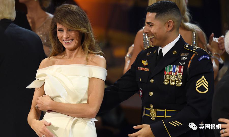 但梅拉尼娅跟其他人的互动就很亲昵,和奥巴马贴面,跟鲜肉仪仗队士兵挽胳膊。