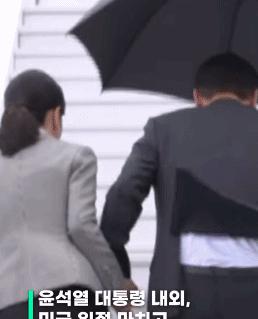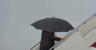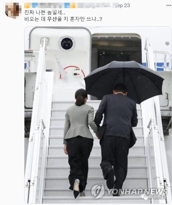 但是上专机时,因为新闻拍摄以及安保原因,工作人员不能跟上去,所以其中一位在舷梯边上递给金夫人一把伞。