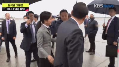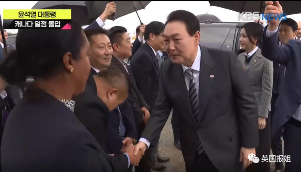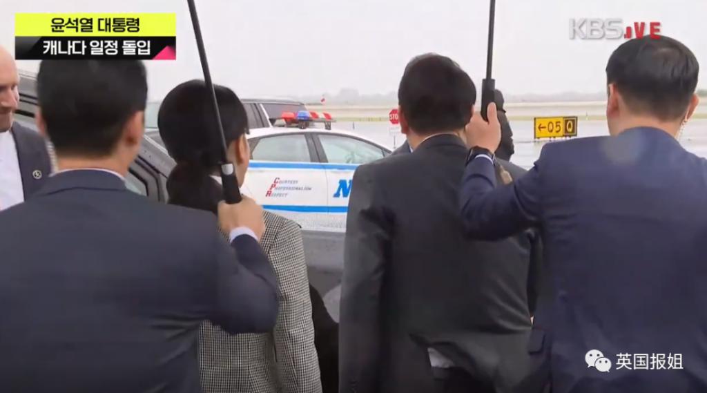 尹锡悦和夫人金建希来到纽约肯尼迪机场,和送别他们的美国官员们道别。当天下了不小的雨,一开始两人身后都有特勤人员帮忙撑伞。