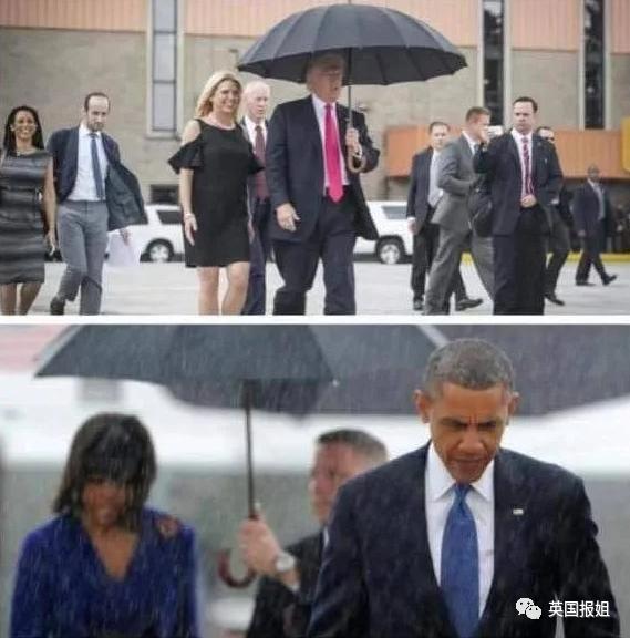 当年不少网友用奥巴马自己淋雨,让工作人员帮妻子米歇尔撑伞的照片和川普做对比,说两人的风度差了太多。