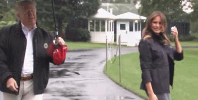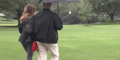 梅拉尼娅就想赶紧到草坪上的直升机里去避雨,谁知道爱出风头的川普又拿着伞跑了,把妻子扔在雨里和电视台的记者聊天。
