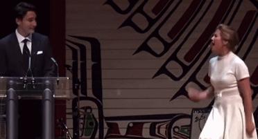 特鲁多演讲进行到一半,主持人出身的妻子索菲突然上台,开始唱自己写的搞笑歌曲,特鲁多则在旁边伴唱,场面突然就凤凰传奇了起来。(特鲁多只唱了类似 " 又又切克闹 " 的歌词)