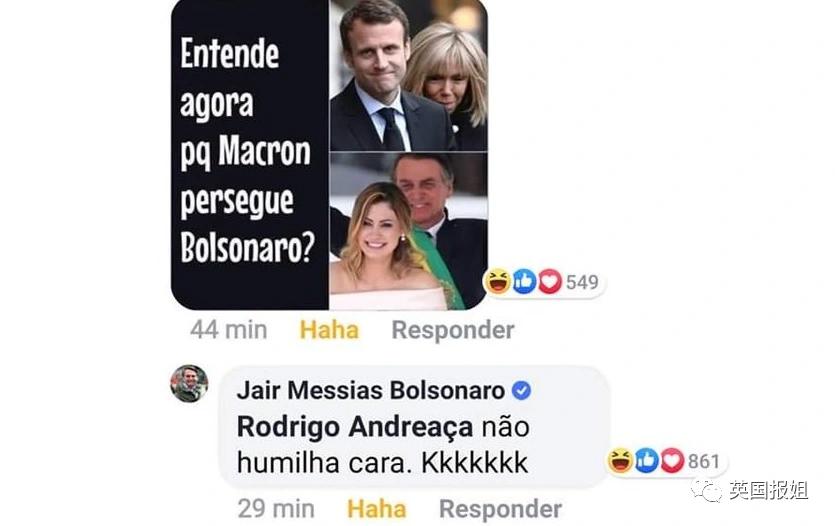 当时博索纳罗把自己妻子和马克龙妻子的照片放在一起,嘲讽布丽吉特 " 长得真丑 ",被马克龙立刻回骂:" 厌女、大男子主义、低级 "。