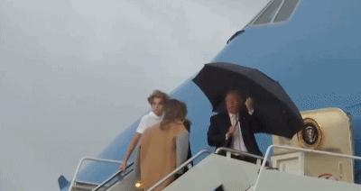 那天风雨交加,川普举着伞自己登上舷梯。过了一会,观众们才发现被风吹得十分凌乱的巴伦自己跑上来。