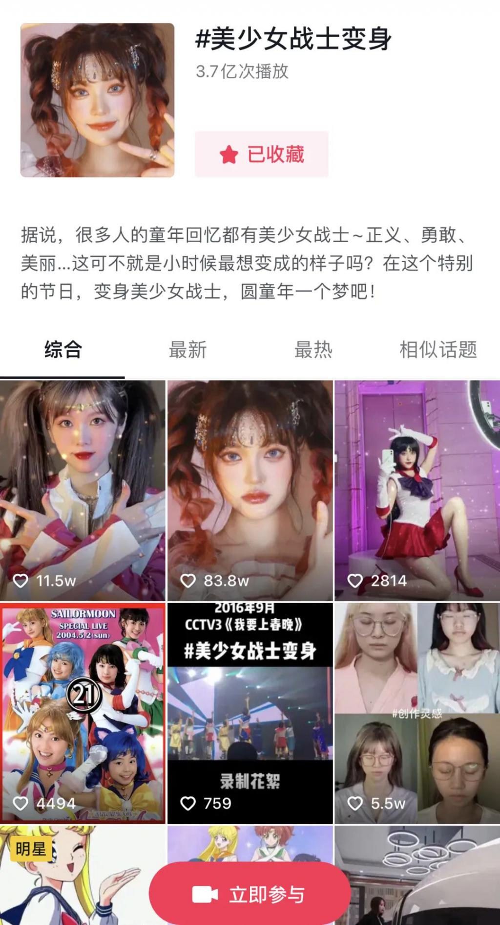 抑或是,时不时在网络上发起的怀旧活动。去年儿童节,抖音就掀起一股# 美少女战士变身的热潮,该话题已达 3.7 亿次观看,参与者用化妆的方式配合《美少女战士》的变身经典音乐完成变妆。