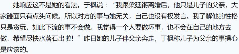 多年后梁廷锵爆出第一次桃色新闻,记者去采访了于枫,她的回答盖棺了是梁廷锵不忠导致第一段婚姻结束。