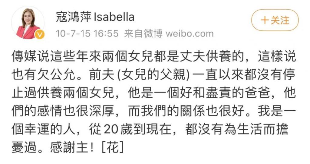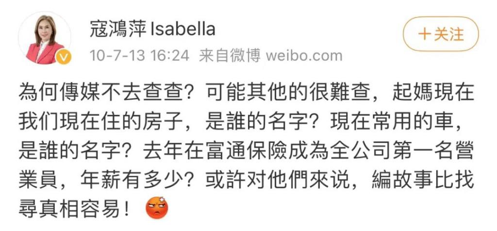 这些猜测气得寇鸿萍连发几条微博否认。