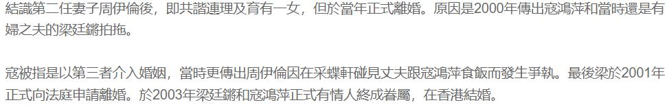 无独有偶,梁廷锵第二段婚姻的结束,据说跟寇鸿萍也有关系。