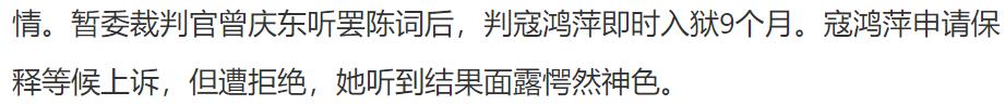 目前寇鸿萍已经在服刑了,如果上诉失败,她要明年中旬才重获自由。
