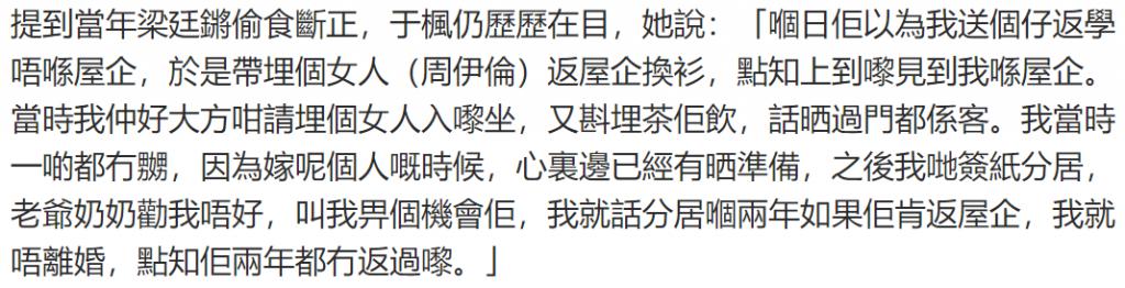 ▲大意是于枫回家看到梁廷锵竟然和周伊伦在她家,本来决心要分居,但公婆对她很好劝她给儿子个机会,于枫就决定如果两年内梁廷锵肯回家就算了,谁知道梁廷锵还真的两年都没回家,最后她决定离婚。