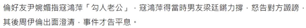 ▲有说周伊伦看到两人一起吃饭的。但是之后梁廷锵为了寇鸿萍怒告周伊伦闺蜜,周伊伦还出来帮忙寇鸿萍说话了。