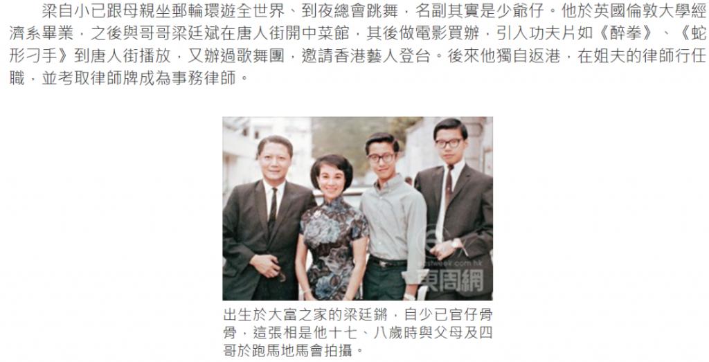 ▲梁家爷爷曾经在澳门买下一条街,单单是收租就很可观,香港也有房产。要说他和娱乐圈也有一点关系,梁廷锵母亲是30年代明星谭玉兰,母亲是父亲的二房。