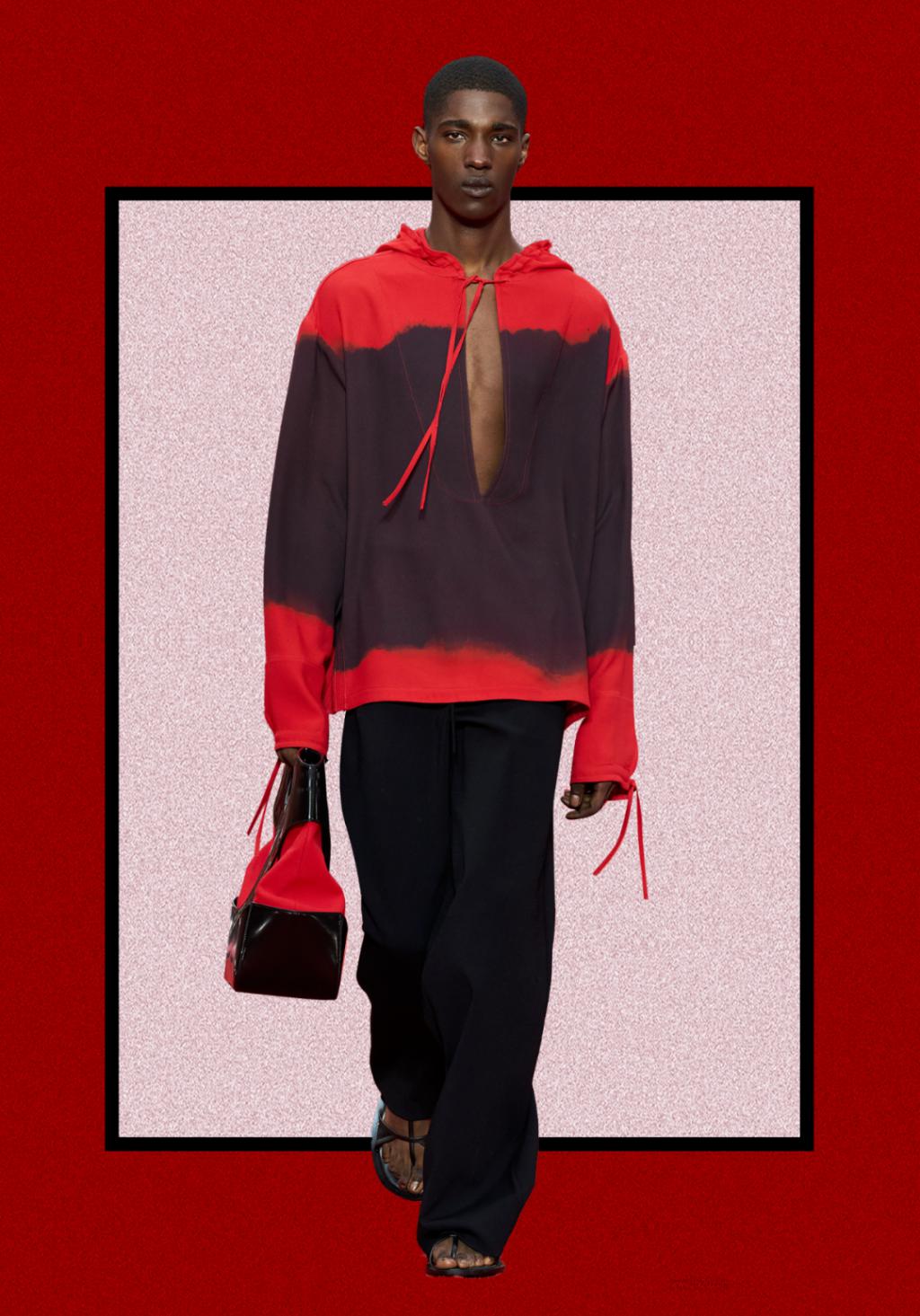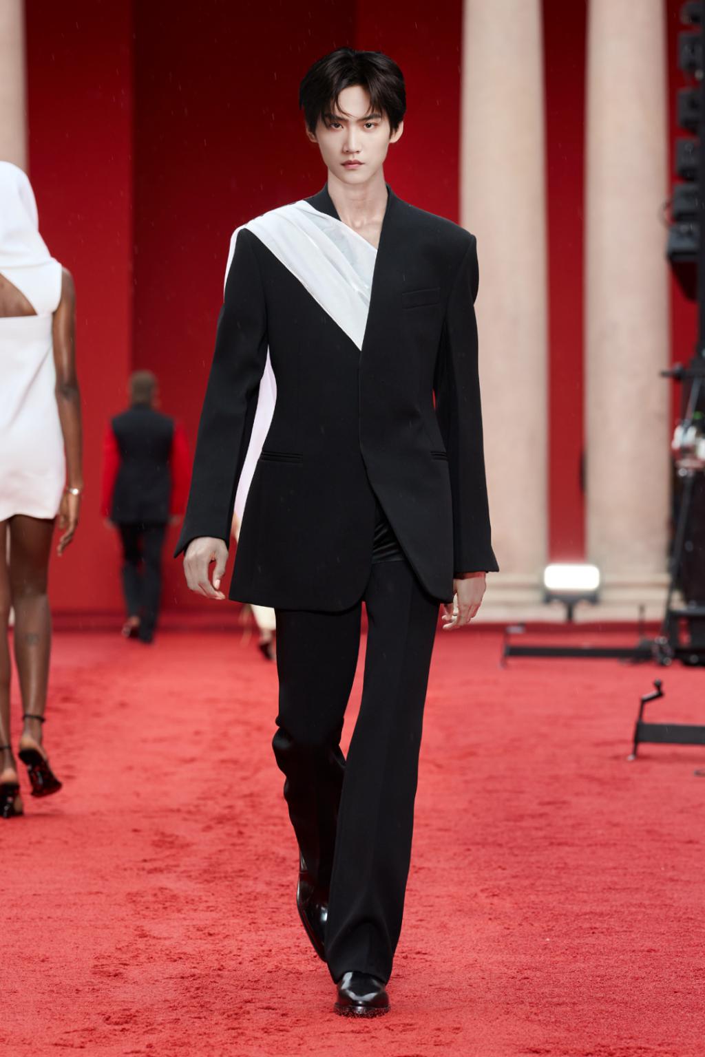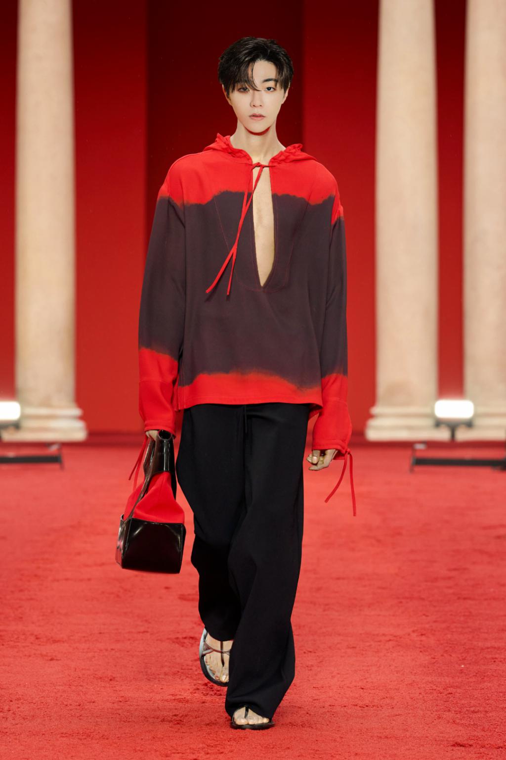 红色像是喷涌而出的火焰,被黑色间隔开,但又不断向中间靠近。而胸口的镂空则会给大家一些若隐若现的遐想,把介于少年和男人之间的气质拿捏得很好。