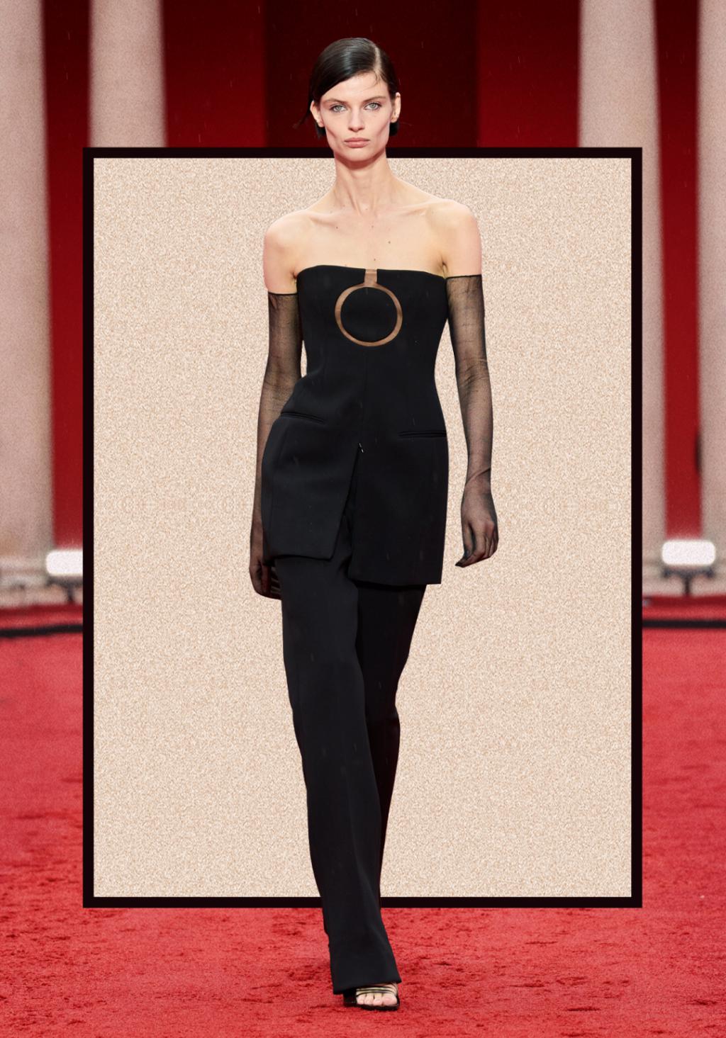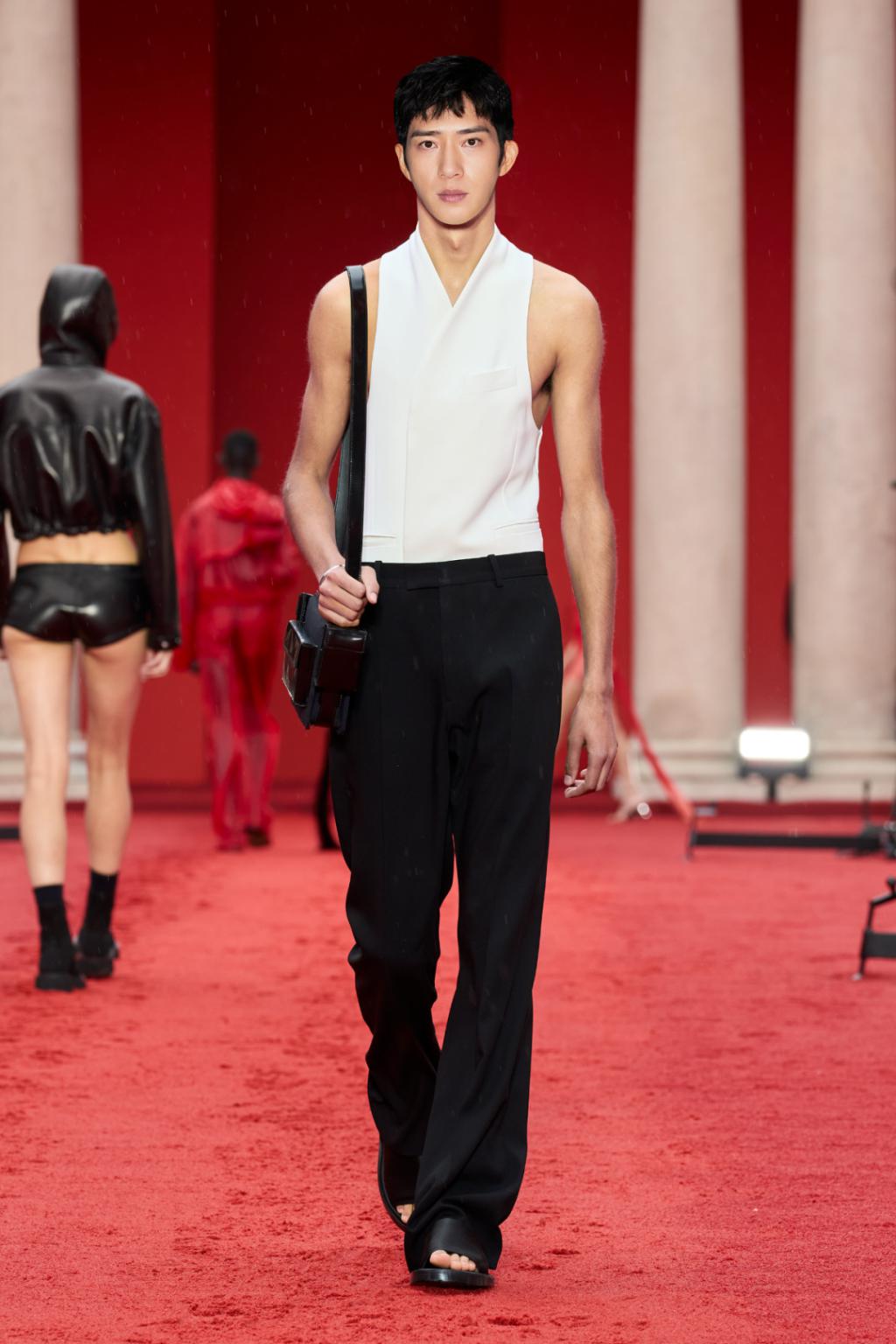 除此之外,设计师还使用了很多黑色和红色进行碰撞,比如这套Look。