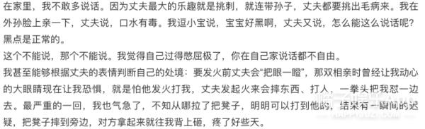 "我爸爸对我妈各种指责,他心情不好,我妈就有压力,就觉得她做好饭了,多干点活,她就能得到一个好脸色。"