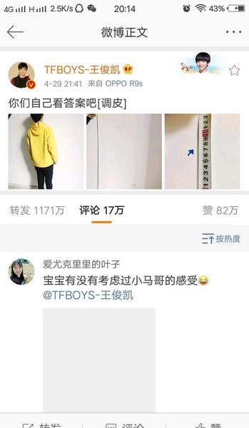 小编给你们具体一点,176.5cm,四舍五入就一米八啦,反正这孩子好像一直想长到一米八。我对王俊凯的实诚真的服气,15岁时被造谣早恋发微博说“你们媒体别瞎写”,16岁时面对私生发微博说“早点回去别等我”,现在17岁面对身高质疑直接脱鞋量了发微博“你们自己看吧”。